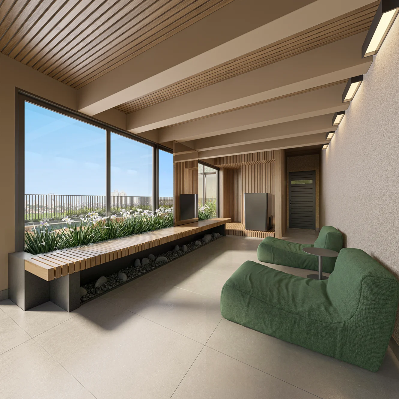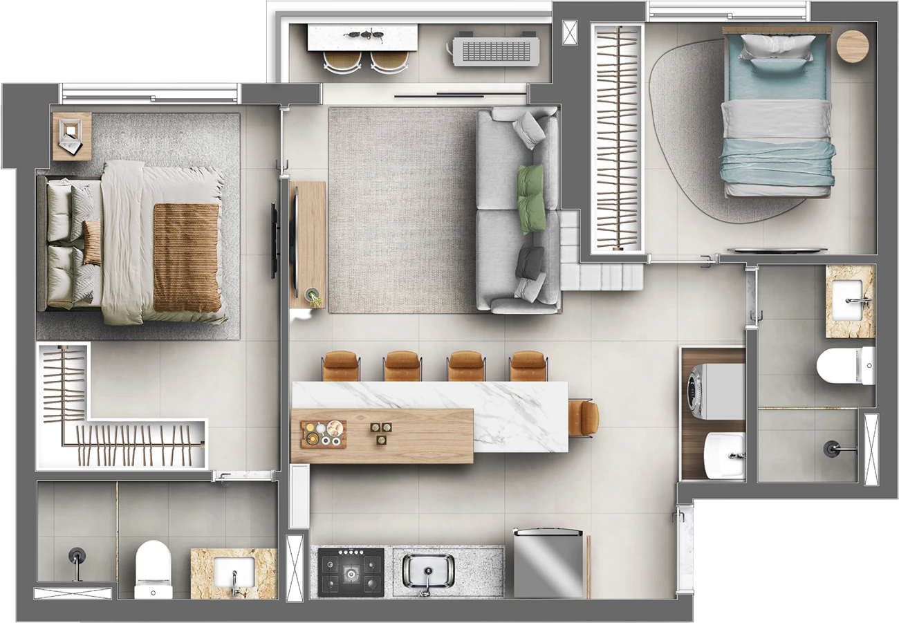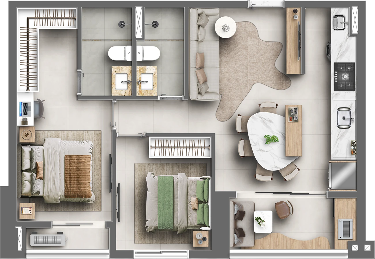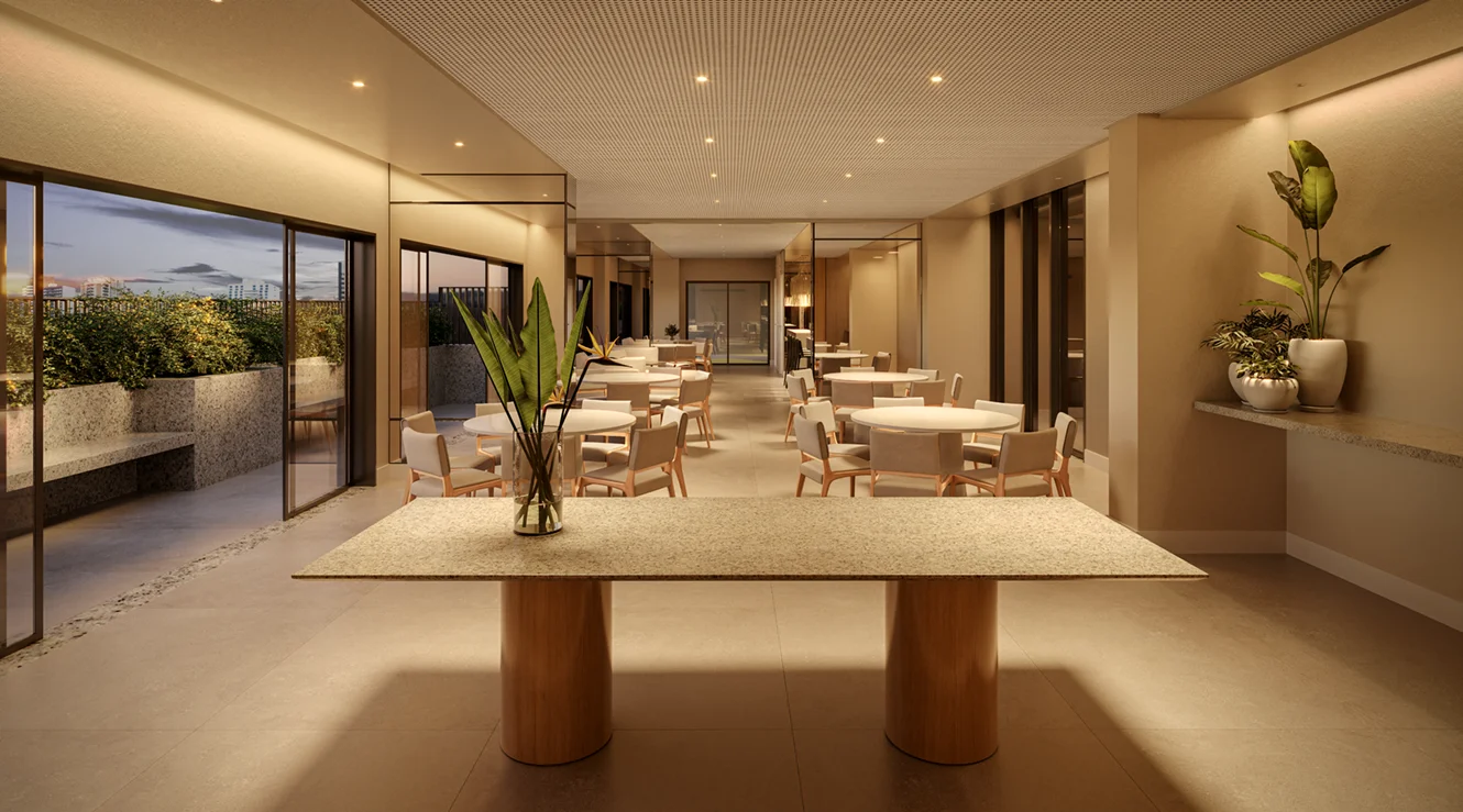 Imagens preliminares e meramente ilustrativas. Todos os itens que compõe o projeto serão entregues conforme memorial descritivo do produto e compromisso de compra e venda. Materiais, vegetação e mobiliários poderão sofrer pequenas alterações conforme disponibilidade de mercado. Na entrega do empreendimento a vegetação poderá apresentar diferenças de tamanho e porte, mas estará de acordo com o projeto paisagístico. Registro de Incorporação RI: R-6-407.395