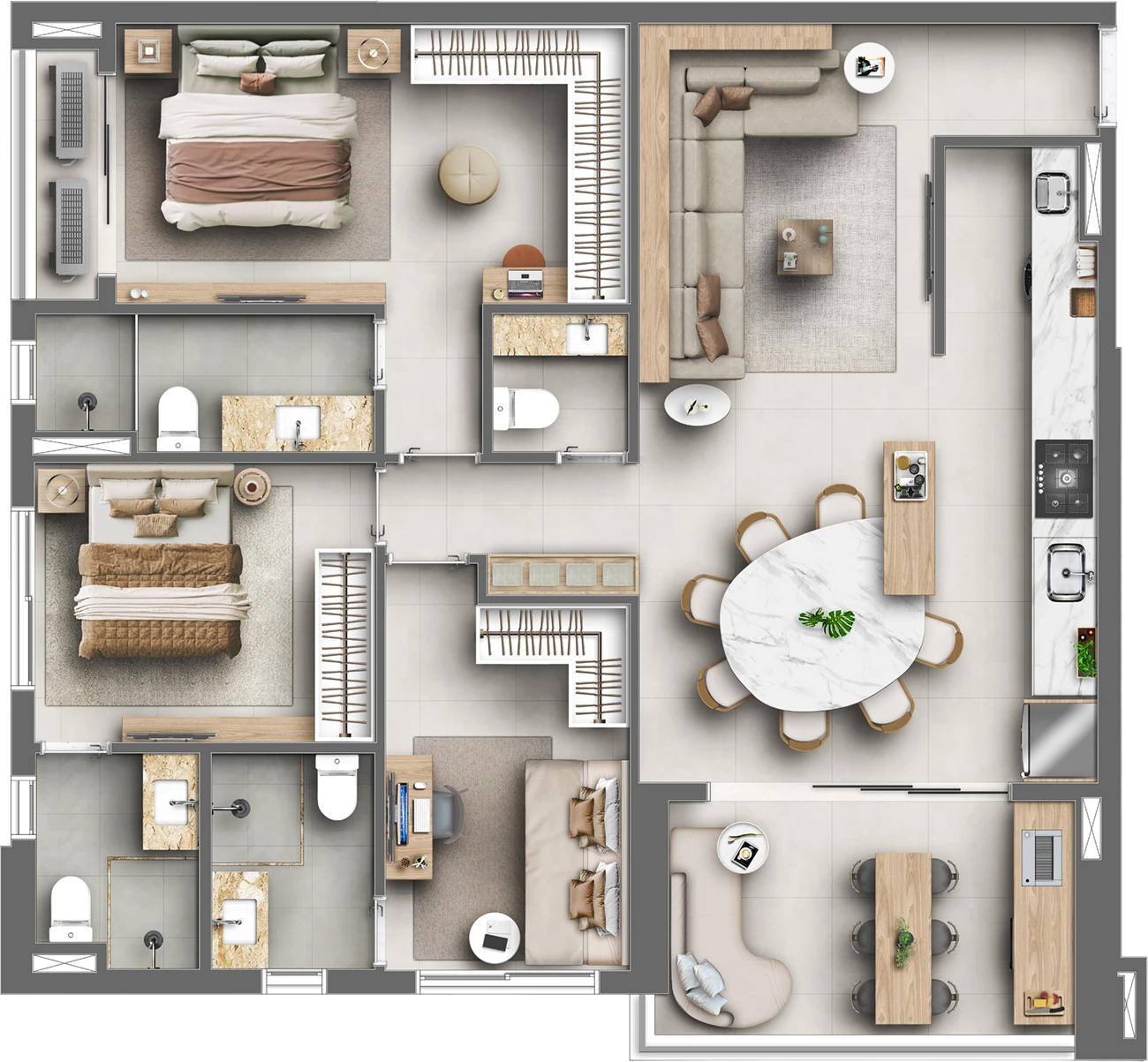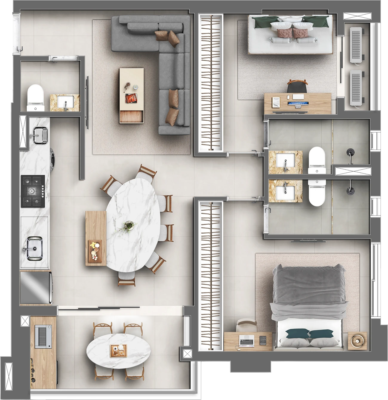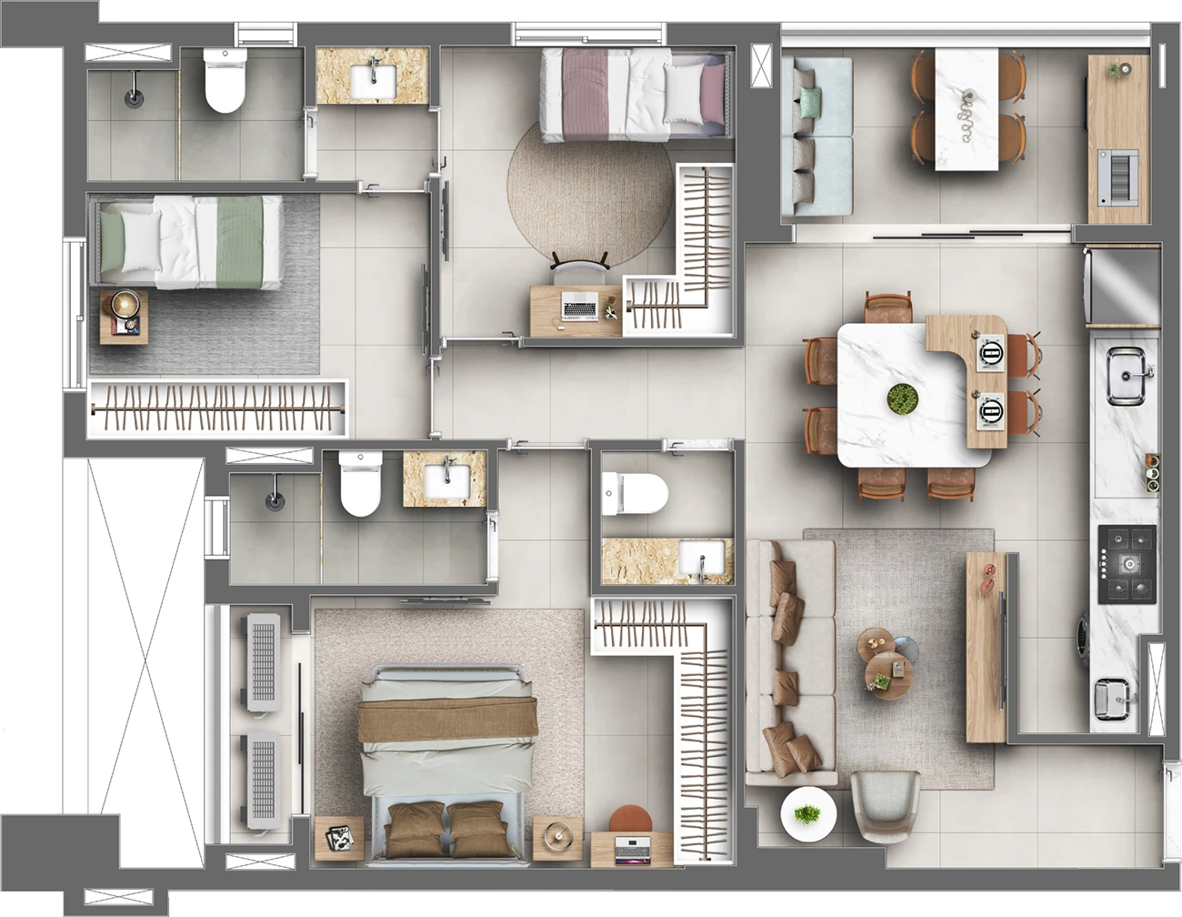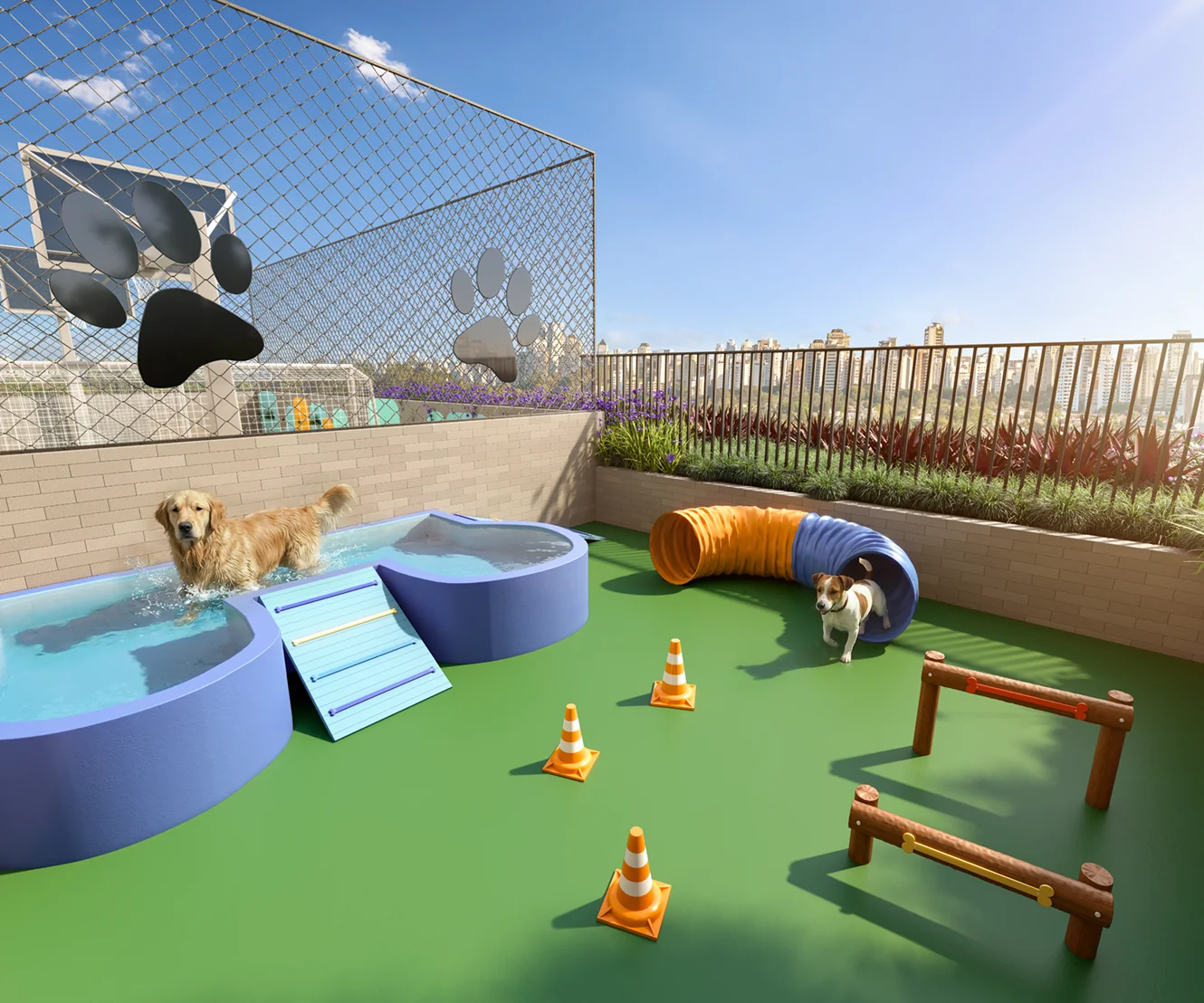 Imagens preliminares e meramente ilustrativas. Todos os itens que compõe o projeto serão entregues conforme memorial descritivo do produto e compromisso de compra e venda. Materiais, vegetação e mobiliários poderão sofrer pequenas alterações conforme disponibilidade de mercado. Na entrega do empreendimento a vegetação poderá apresentar diferenças de tamanho e porte, mas estará de acordo com o projeto paisagístico. Registro de Incorporação RI: R-6-407.395